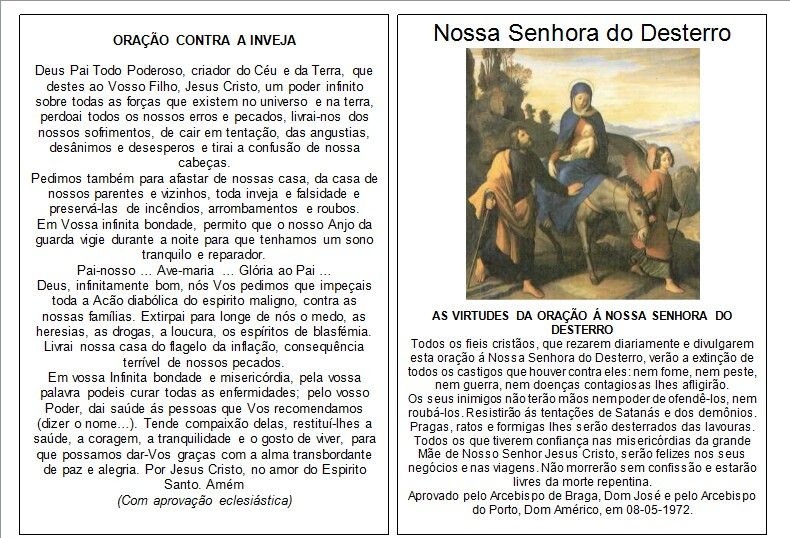 "Ó Maria Santíssima, Mãe de Deus e nossa Mãe querida, vós sois o refúgio dos pecadores e o auxílio dos cristãos. Com o vosso poder, nós vos suplicamos, Santa Mãe de Deus, livrai-nos de todos os perigos que nos cercam e nos afastam do amor de vosso Filho Jesus.