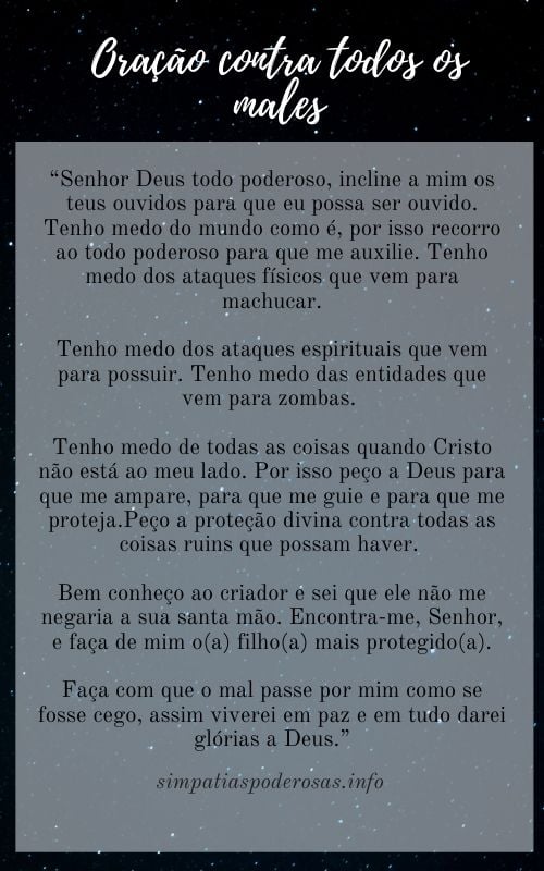 A oração contra todos os males, como diz o próprio nome, pode te ajudar a se livrar de todo o tipo de situação negativa, desde coisas físicas como acidentes ou dores fortes, ou até mesmo ataques espirituais como possessões.