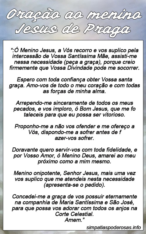 “:Ó Menino Jesus, a Vós recorro e vos suplico pela intercessão de Vossa Santíssima Mãe, assisti-me nessa necessidade (peça a graça), porque creio firmemente que Vossa Divindade pode me socorrer.