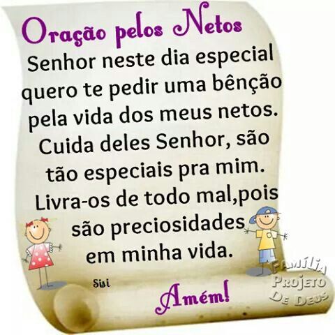"Senhor, eu te peço que protejas meus netos com a tua mão poderosa. Que eles sejam guardados de todo mal e de toda influência negativa. Que sejam cercados pelo teu amor e pela tua luz, e que cresçam fortes e saudáveis em todos os sentidos. Eu te agradeço, Senhor, pela vida dos meus netos e pela oportunidade de amá-los e cuidar deles. Que assim seja."